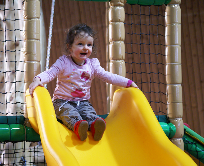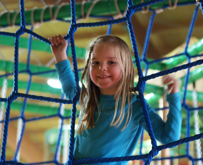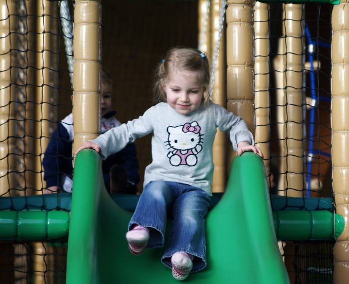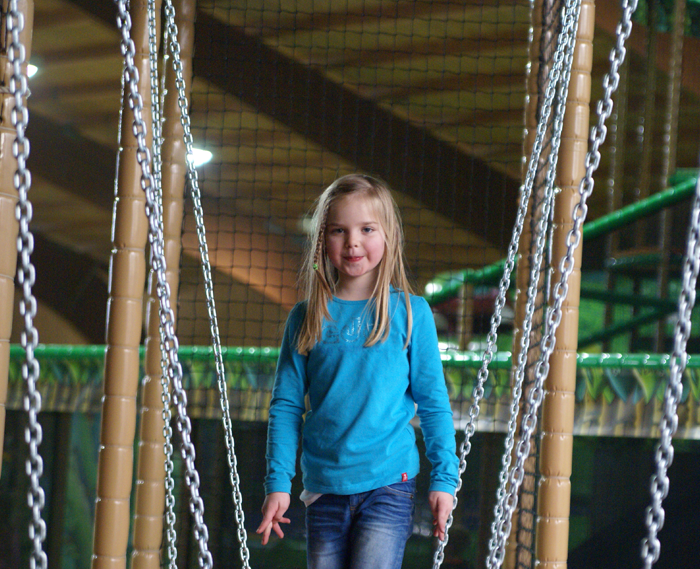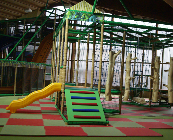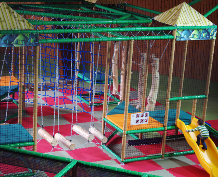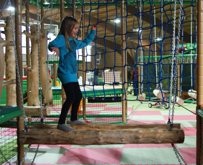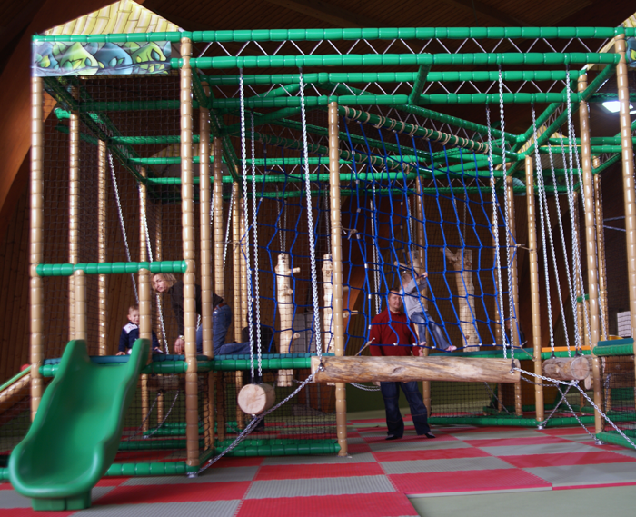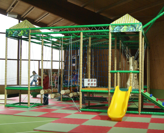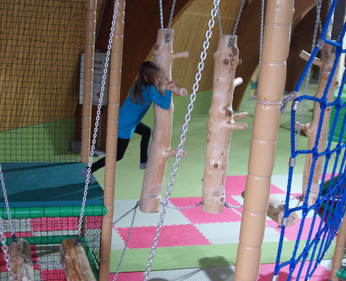 Die Seile mögen tief gespannt sein, aber die Anforderungen sind die gleichen. Egal ob hoch oder tief: Wer drüber kommen will, muss balancieren können. Balancieren kann man auch über die naturbelassenen Baumstämme, und wer seinen Klettertrieb ausprobieren möchte, kann auch das in dieser schönen phantasievollen Anlage. Wer wieder runter will, kann einfach abspringen oder galant über die kleine Rutsche zum Boden gleiten.